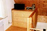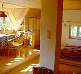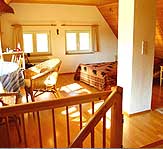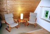 Neben den Sitzbereichen finden Sie hier die Mini-HiFi-Anlage mit CD & MC. Zwei in die Dachschrägen eingebaute Wandschränke bieten Ihnen reichlich Stauraum. Der teilweise Wandausbau in Holz und der Parkettfußboden sorgen für eine behagliche und dennoch unverschnörkelte Atmosphäre. Insbesondere die Sitzgruppe am Fenster der Dachgaube bietet Ihnen einen wunderschönen Blick auf die Natur außerhalb. |